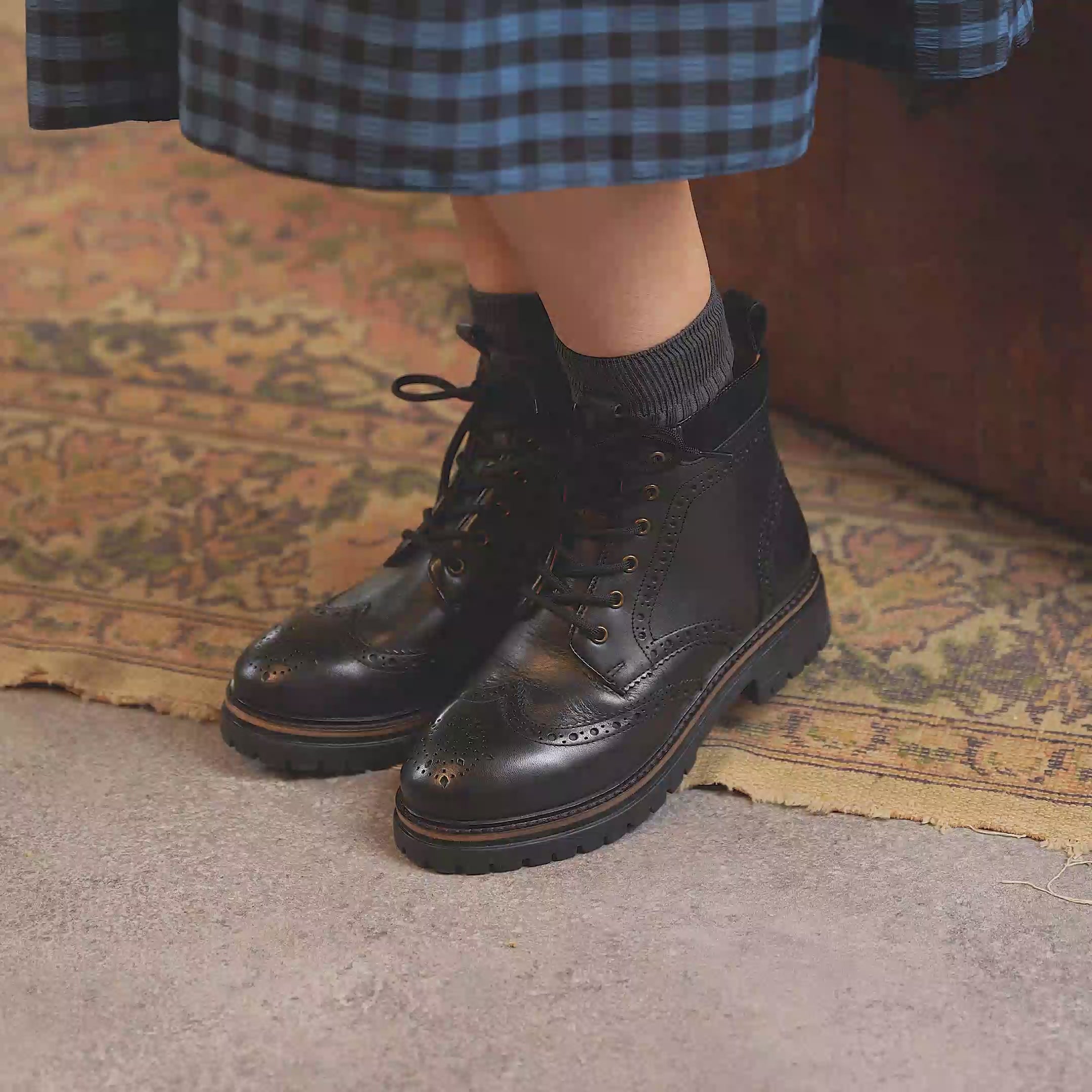 The Langho Black are high grade genuine leather boots and are part of our women's 1985 collection. These black derby brogue boots are built on our LX-Y last and made with a cemented construction.