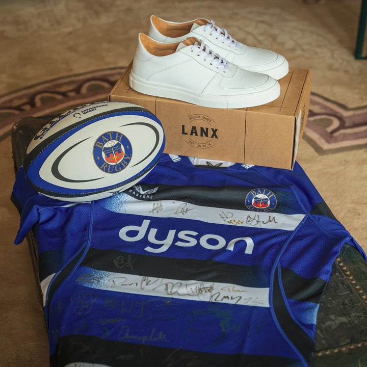 4 hospitality tickets to the Blue, Black and White club to watch Bath V Leicester Tigers on 06.06.2026, a signed Bath Rugby Home shirt, a signed Bath Rugby ball, and 2 pairs of LANX footwear.
